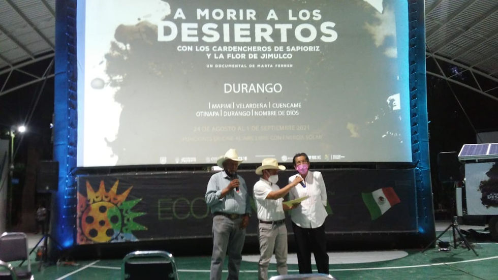 El pasado martes por la tarde noche, se presentó el documental “A Morir a los Desiertos, con los cardencheros de Sapioriz y la Flor de Jimulco” a través de la Gira ECOCINEMA, donde estuvieron presentes Don José Guadalupe, Yolanda e Iginio, cardencheros originarios de Sapioriz.