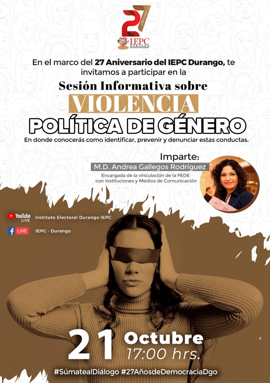 El Instituto Electoral y de Participación Ciudadana del Estado de Durango (IEPC), en el marco de su 27 Aniversario de fundación, realizó una Sesión Informativa denominada “Violencia política por razones de género”, impartida por la M.D. Andrea Gallegos Rodríguez, encargada de la vinculación entre la Fiscalía con Instituciones y medios de comunicación de la Fiscalía Especializada en Delitos Electorales del Estado de Nuevo León (FEDE).