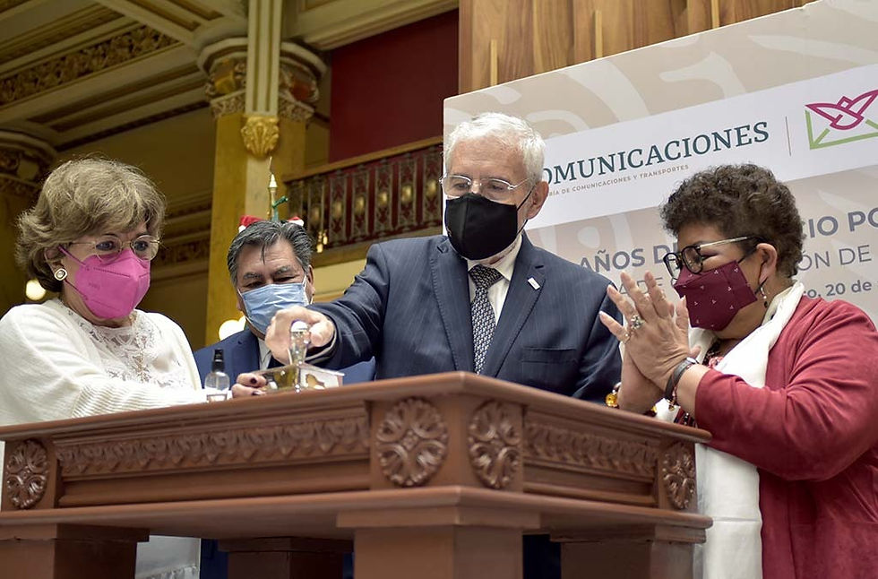 El secretario de Comunicaciones y Transportes, Ing. Civil Jorge Arganis Díaz-Leal, y la directora general de Sepomex, Lic. Rocío Bárcena Molina, cancelaron el primer día de emisión de la estampilla conmemorativa “35 años de primeros momentos, 35 años del Servicio Postal Mexicano”.